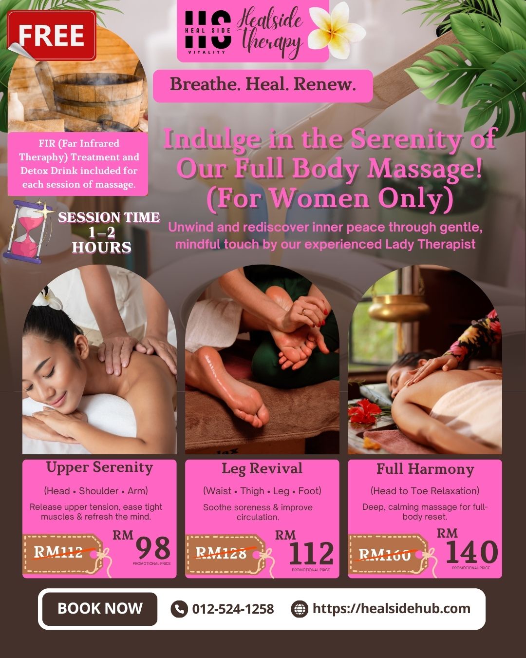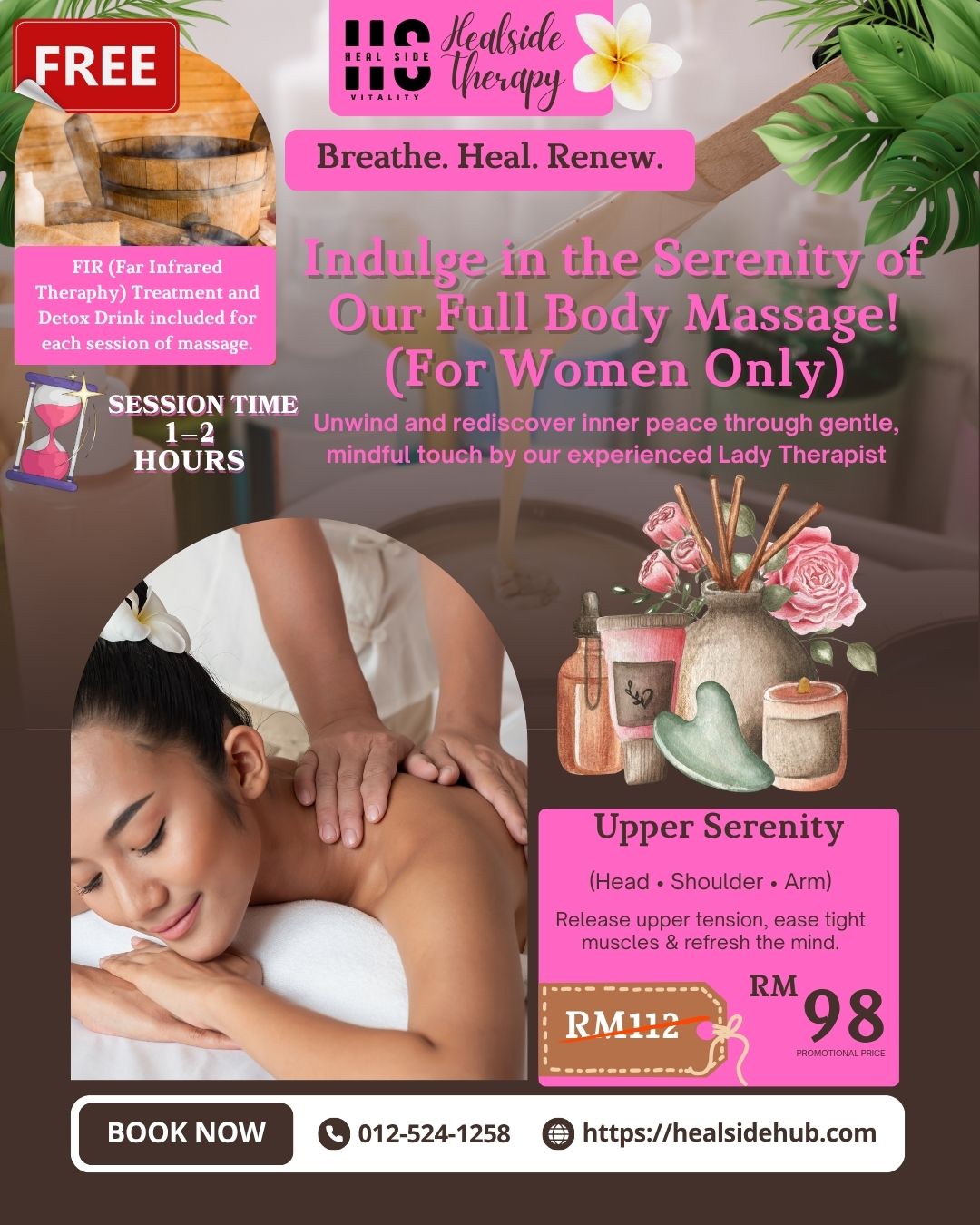 FREE Detox Drink served after your session to help your body flush out toxins naturally and rehydrate after deep relaxation. Together, these add-ons complete your wellness journey helping your body heal from within while your mind regains calm.
